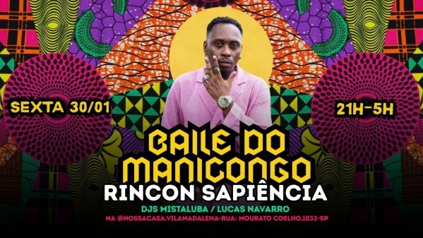 Prepare-se para o Baile do Manicongo com Rincón Sapiência na Nossa Casa em São Paulo! O evento acontece dia 31/01/2026, com início às 01:00h e término previsto para 08:00h. Tudo isso no NossaCasa Confraria das Idéias - Vila Madalena. Não perca!